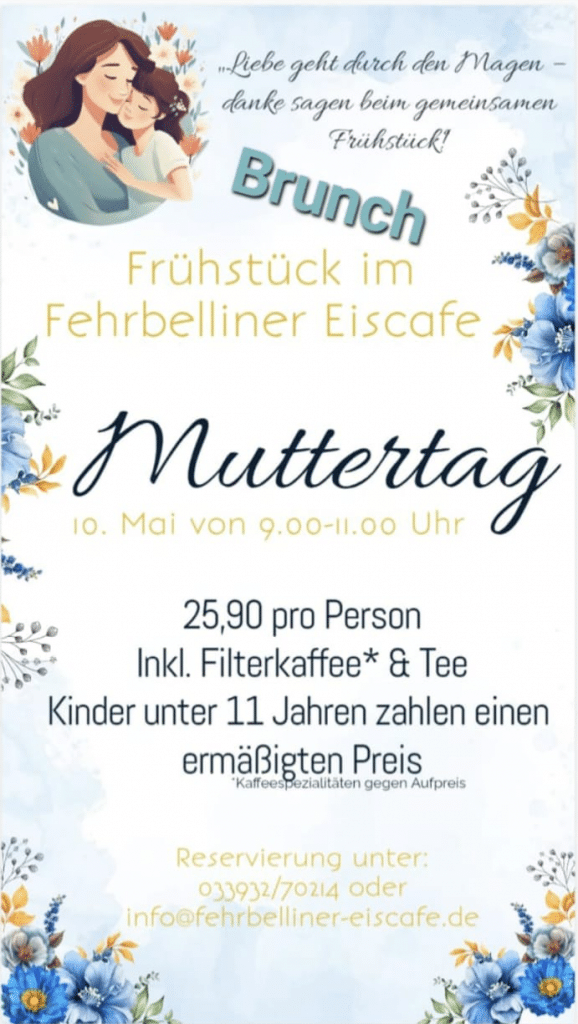 Geduldig trägt deine Mutter, für dich so manche Last, drum halte sie auch lieb und wert so lange du sie hast. Wir wünschen allen einen schönen Muttertag. Das Fehrbellin- Eiscafé